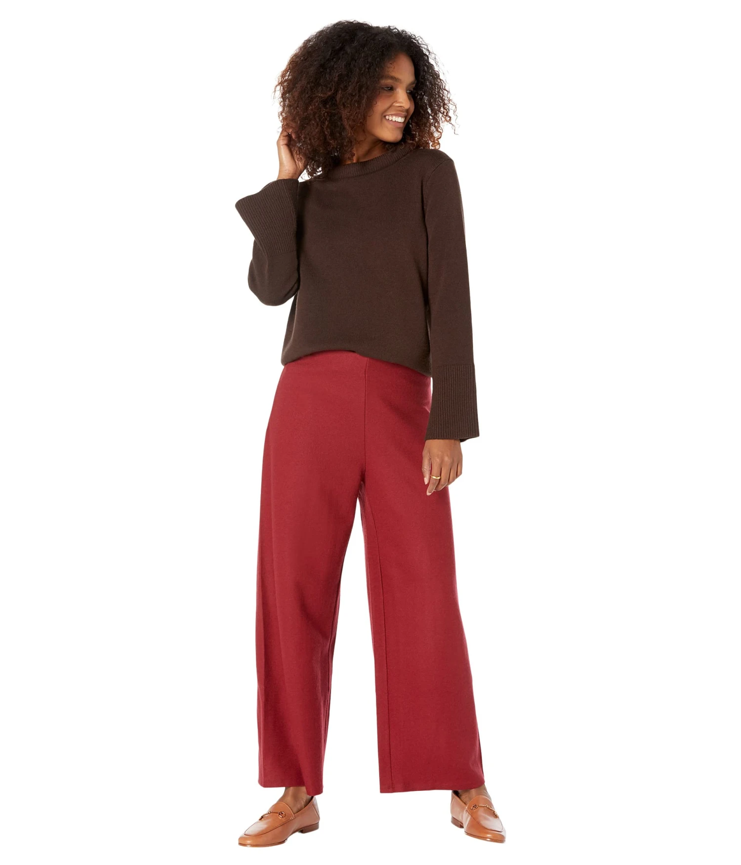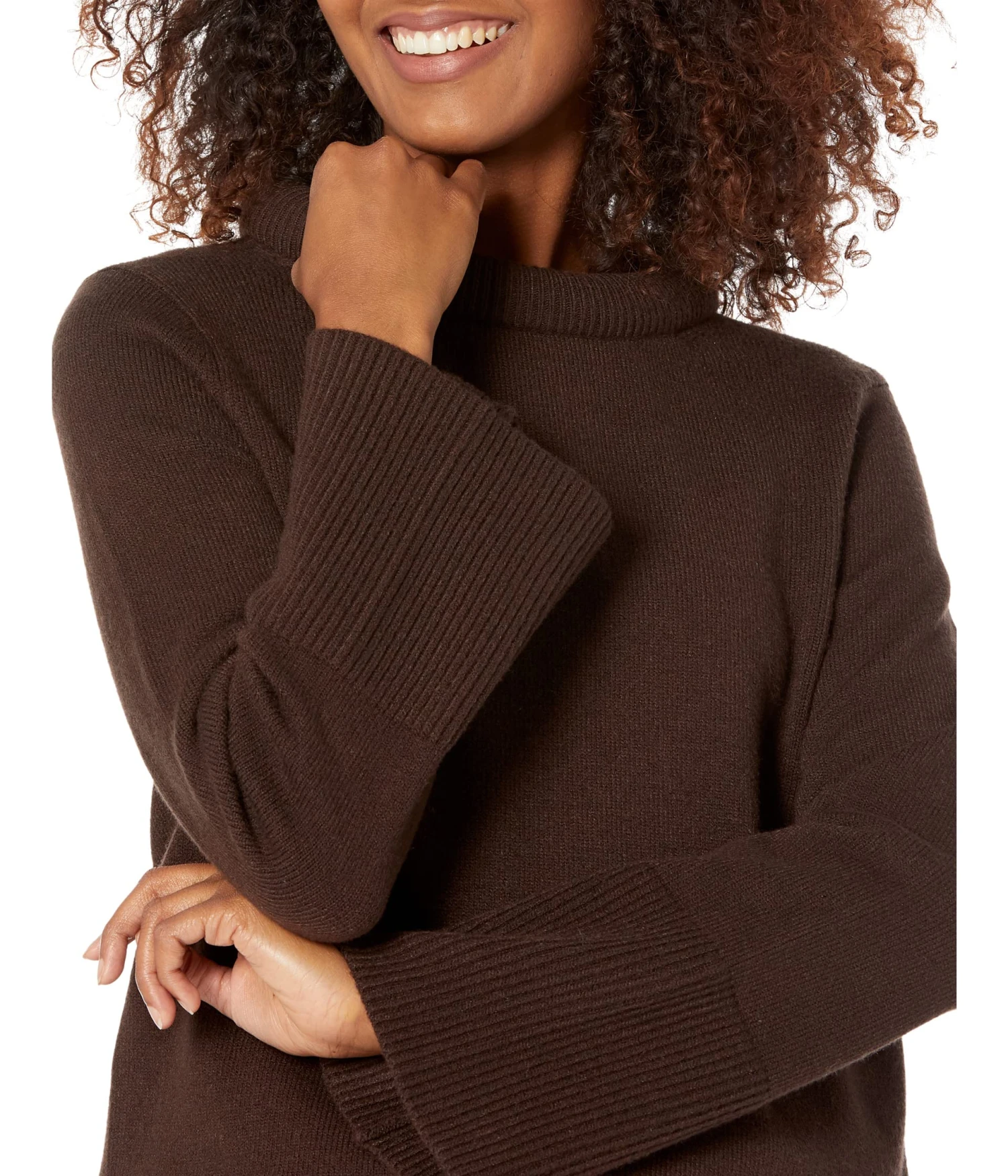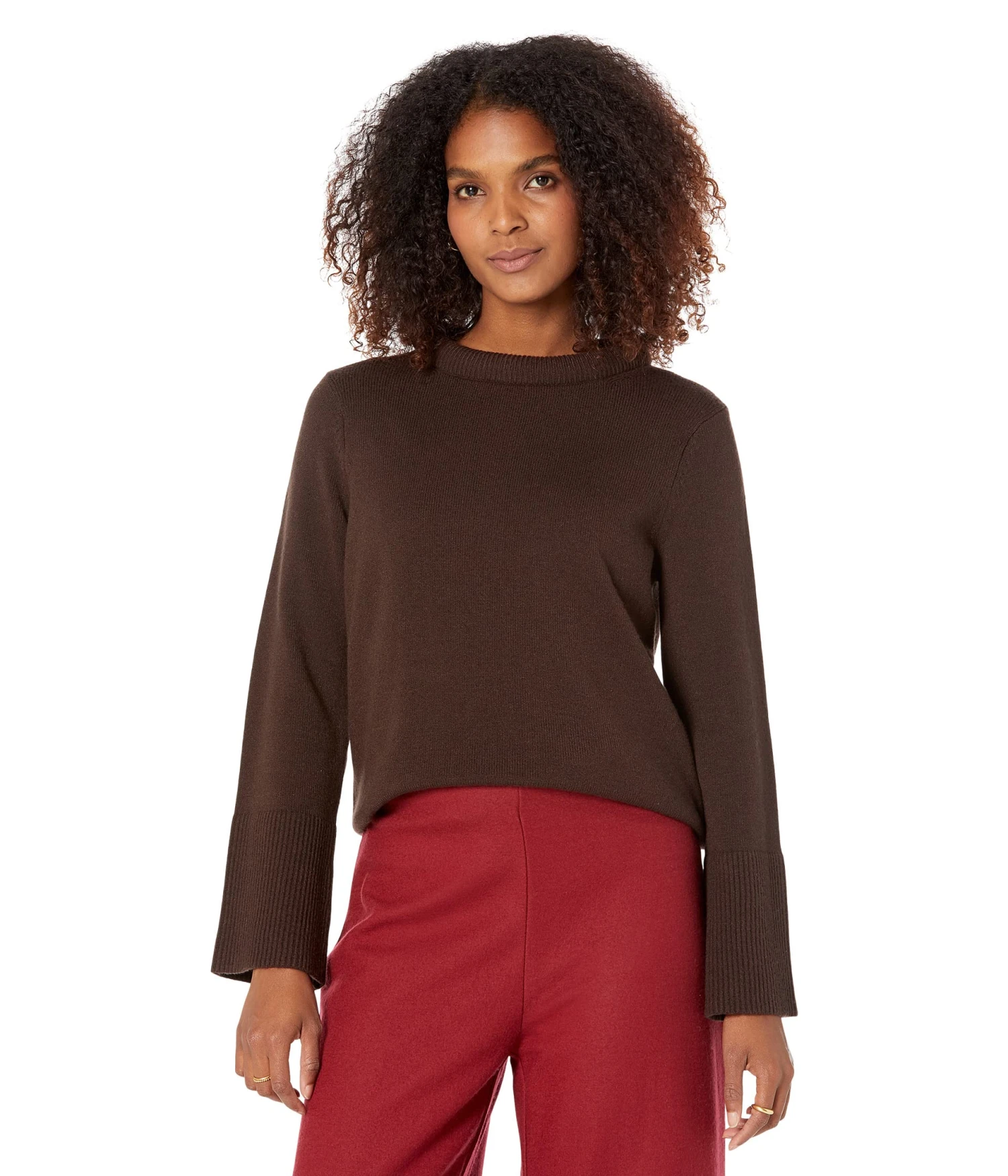 - Rolled crew neckline and long sleeves with wide cuffs.