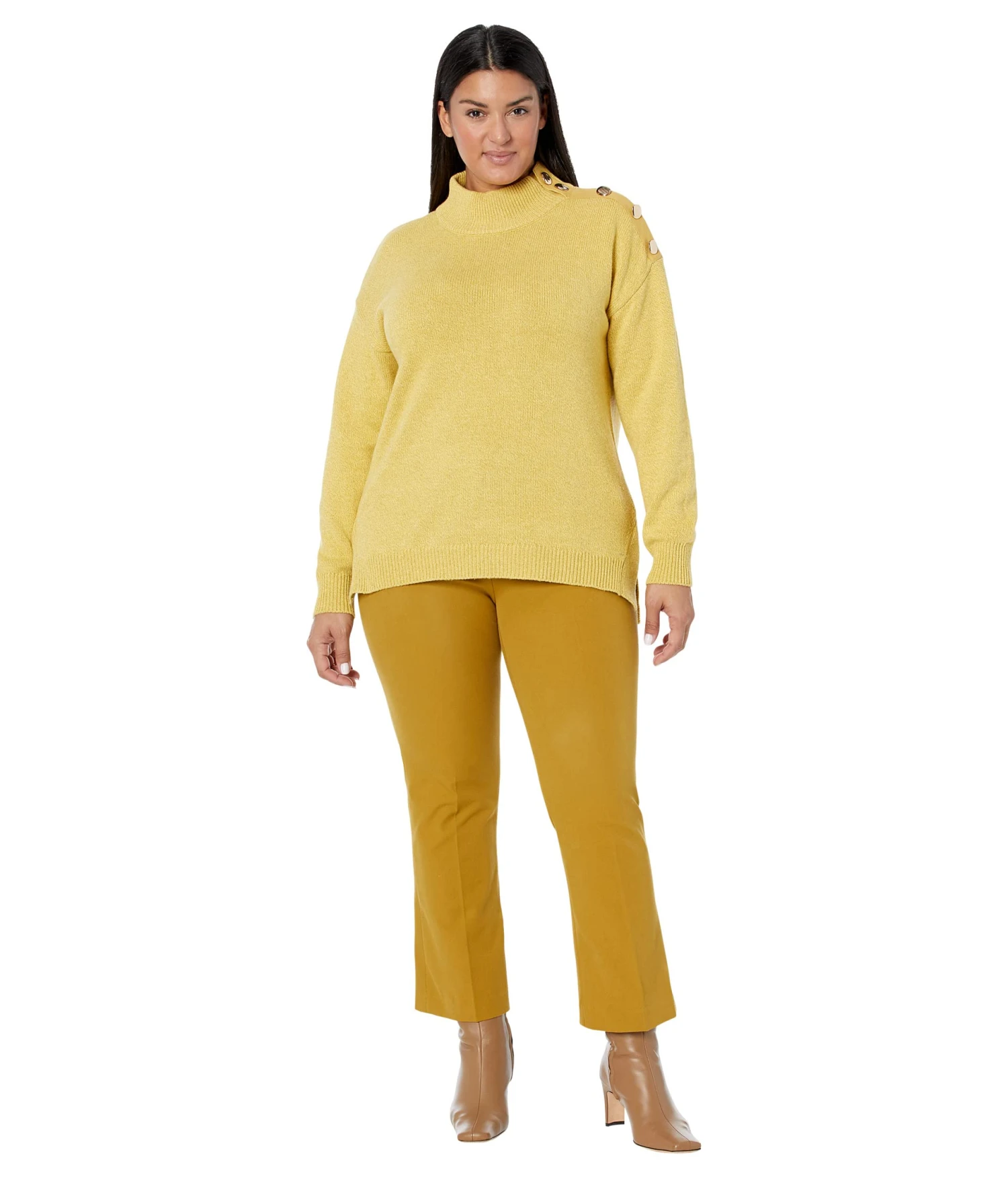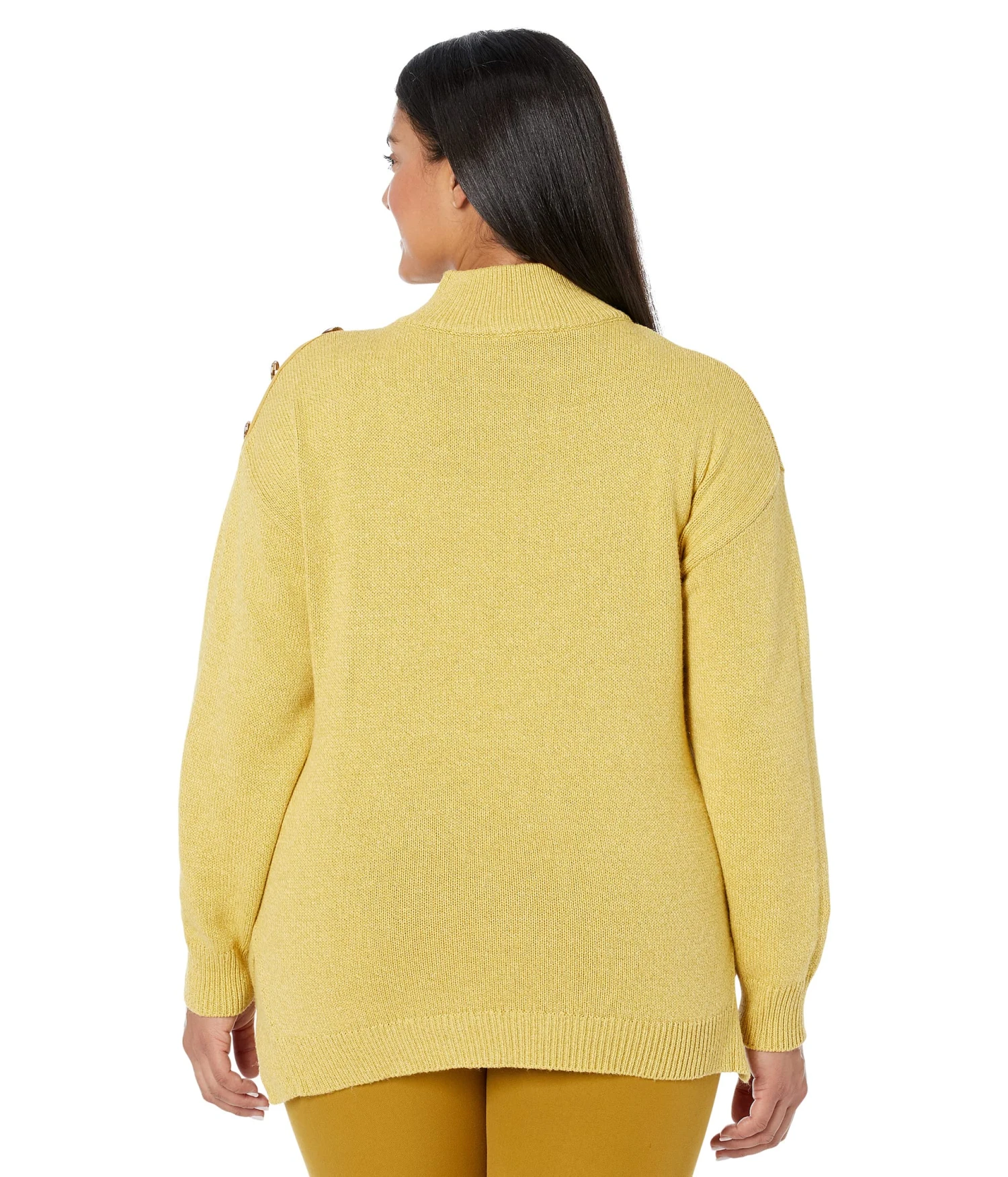 - Mock neckline and button detailing on the shoulders.