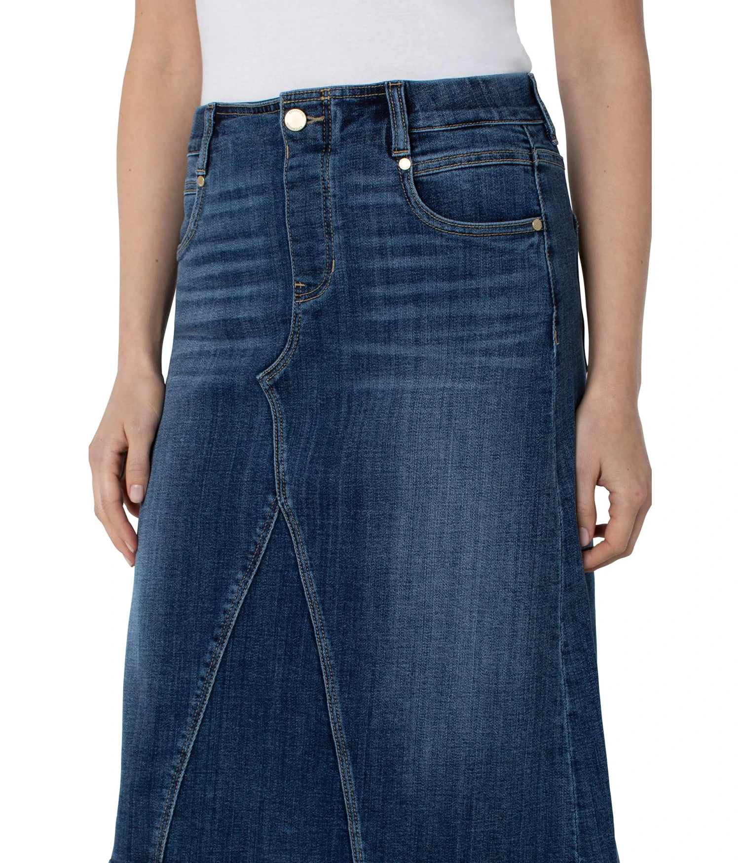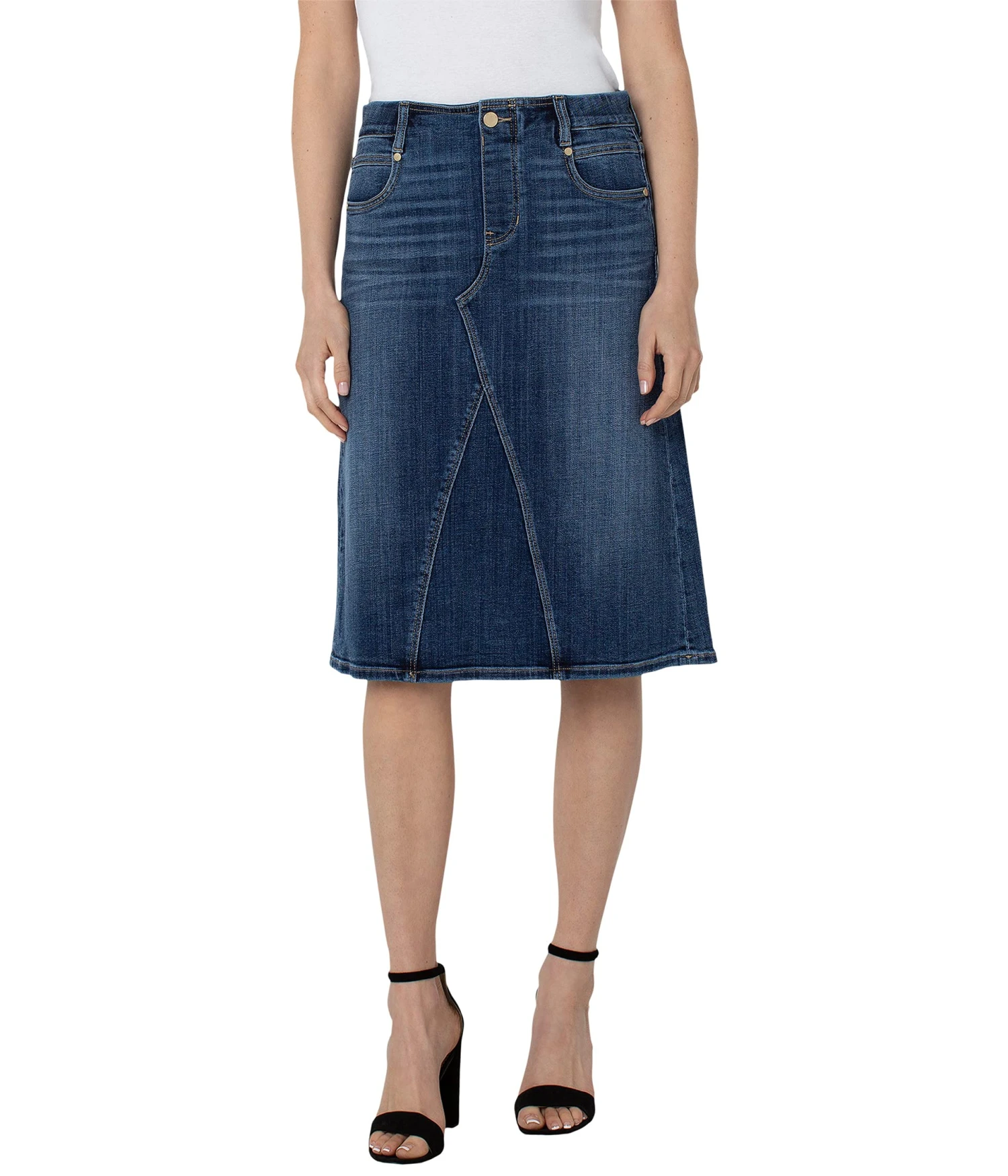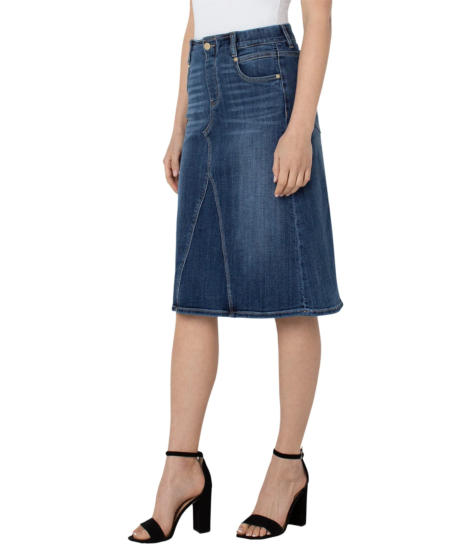 - The super chic Liverpoolâ„¢ Gia Glider Pull-On Midi Skirt in Flagstone adds a flattering look for any occasion featuring a classic high waisted to below the knee skirt with four pocket construction and belt loops through the waist with button-front and zip-fly closure.