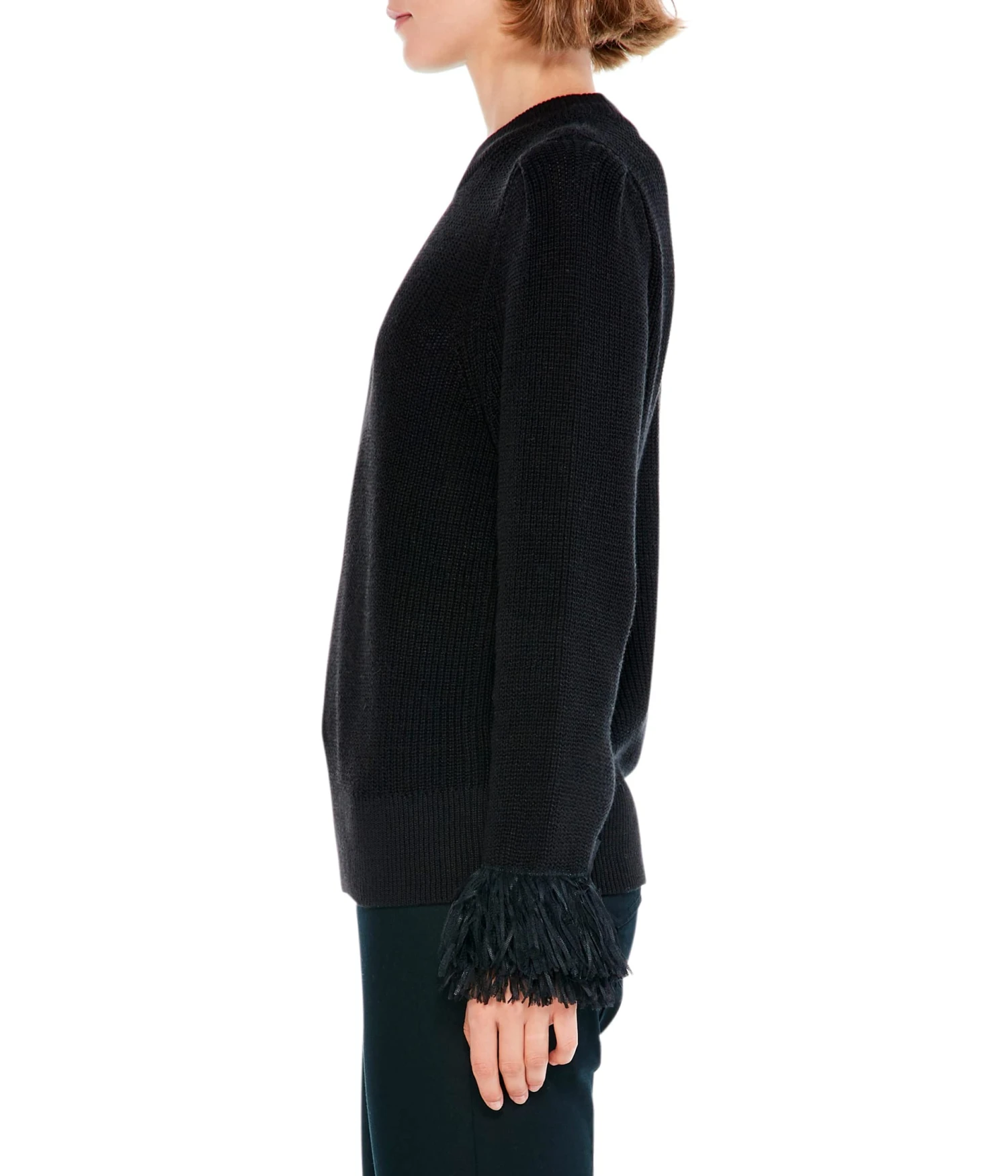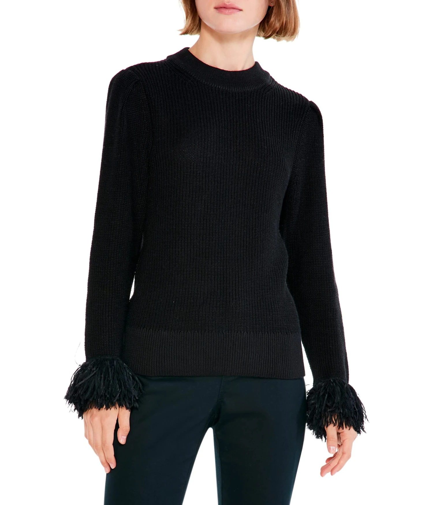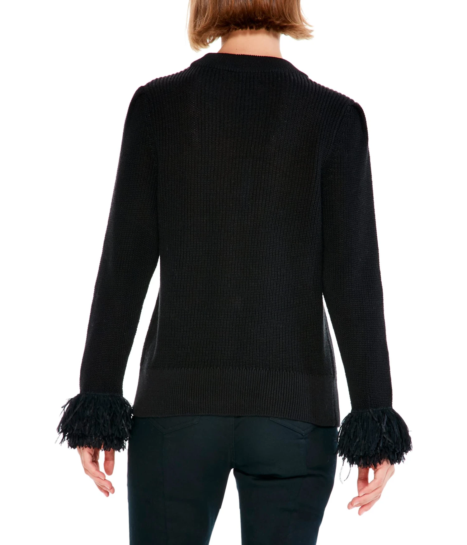 - Pleated sleeve with fringe cuffs.