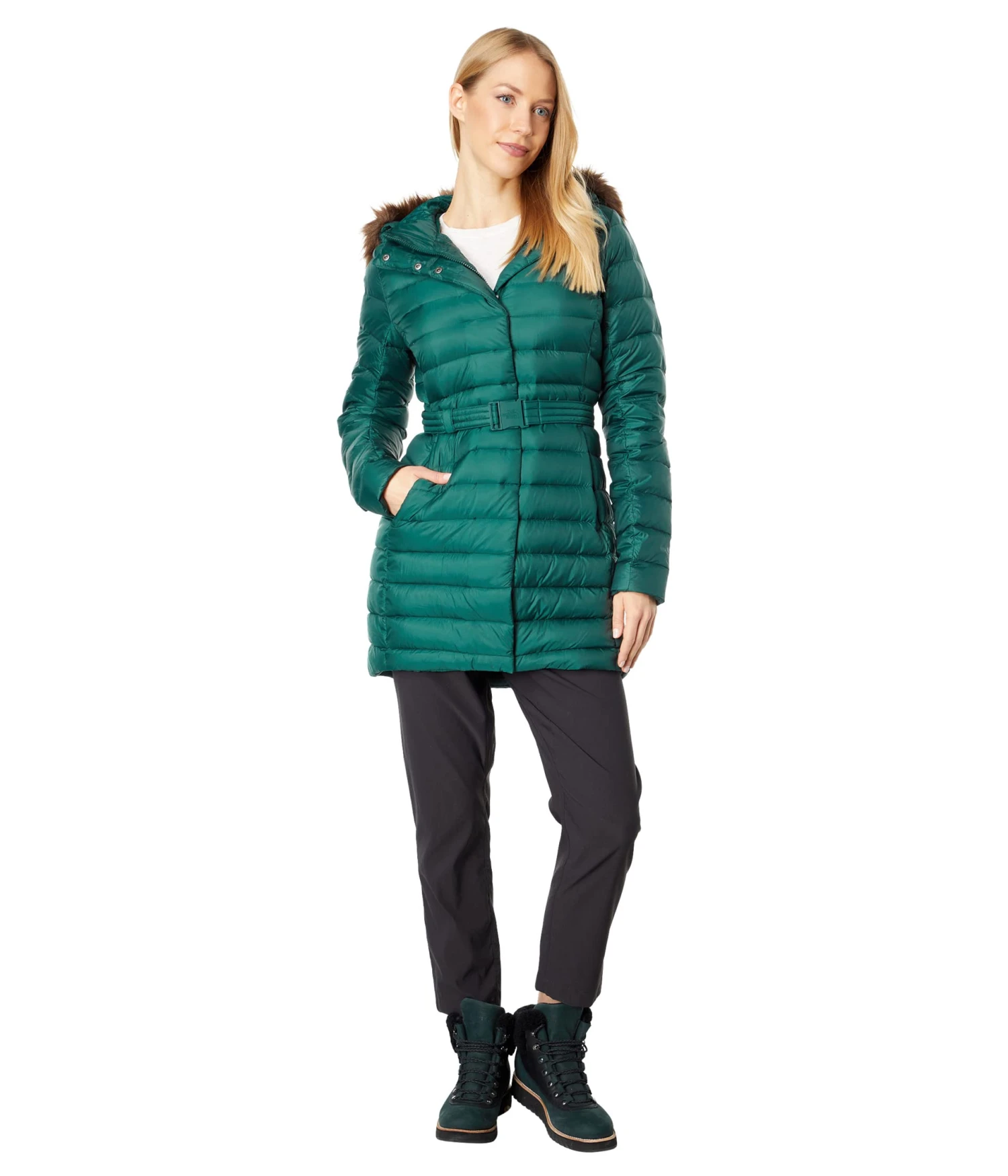 - Insulated, attached hood with a faux fur trim.