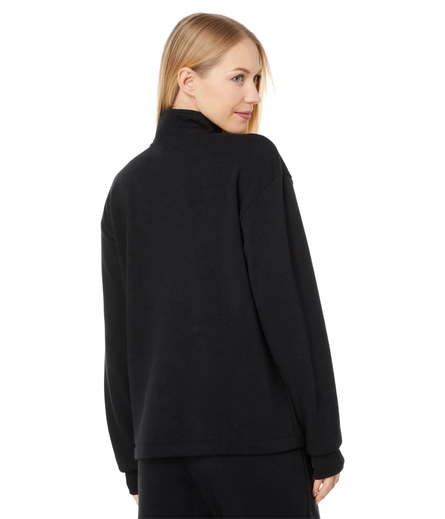 - Mock neckline and long sleeves with banded cuffs.